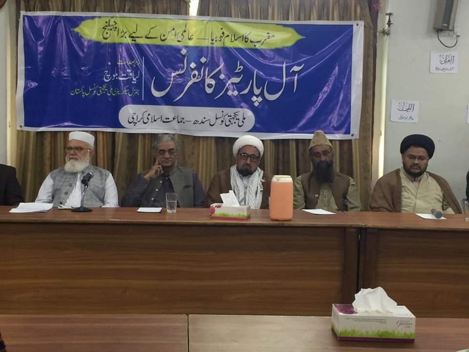 کراچی جعفریہ پریس : ملی یکجہتی کونسل پاکستان کے زیر اہتمام آل پارٹیز کانفرنس مغرب کا اسلاموفوبیا عالمی امن مے لئے چیلنج کے عنوان سے کراچی میں منعقد ہوئی جس میں شیعہ علماء کونسل پاکستان سندھ کے صدر و سینئیر نائب ملی یکجہتی کونسل سندب علامہ سید ناظرعباس تقوی آل پارٹیز کانفرنس شرکت اور خطاب فرمایا